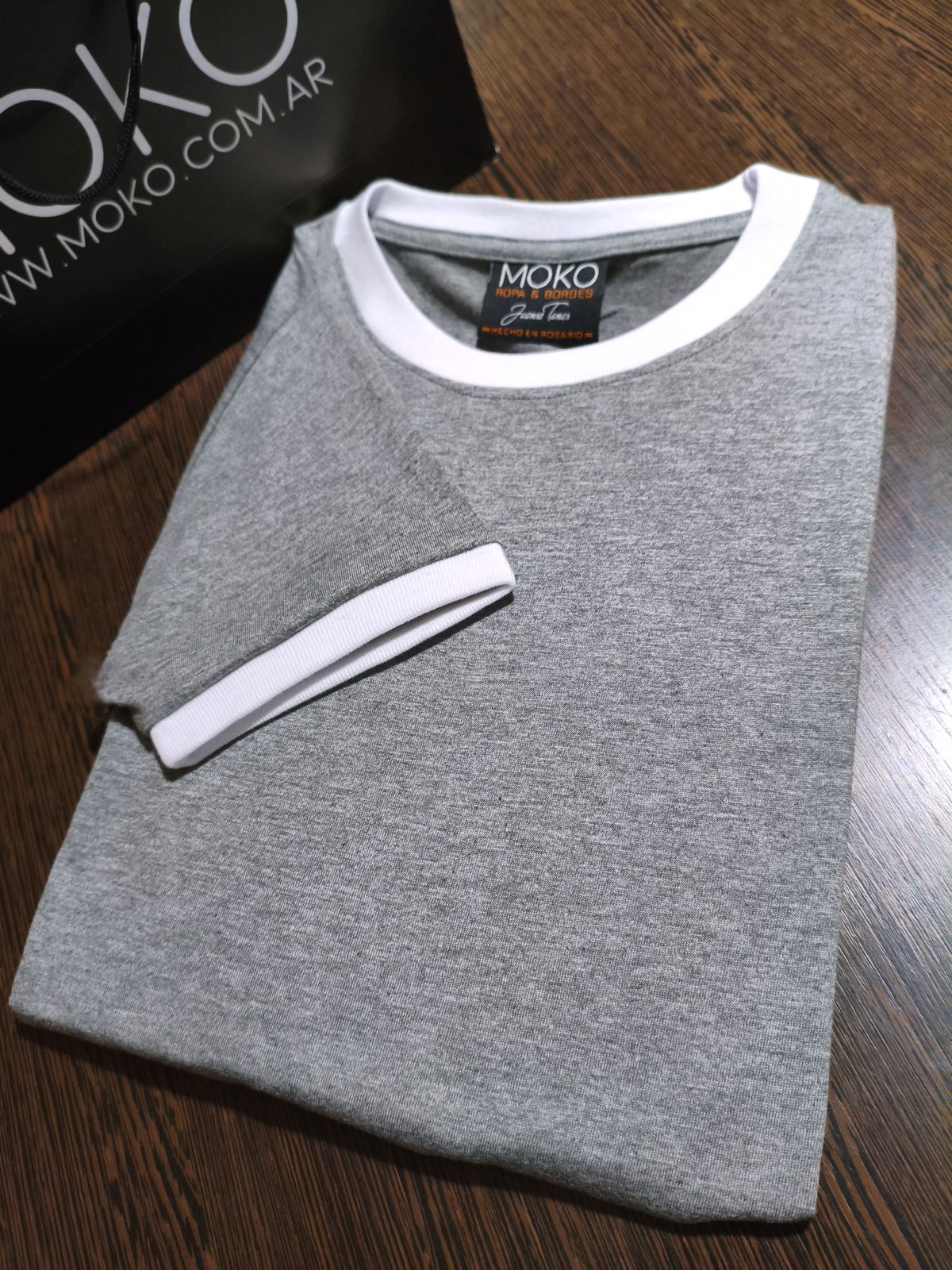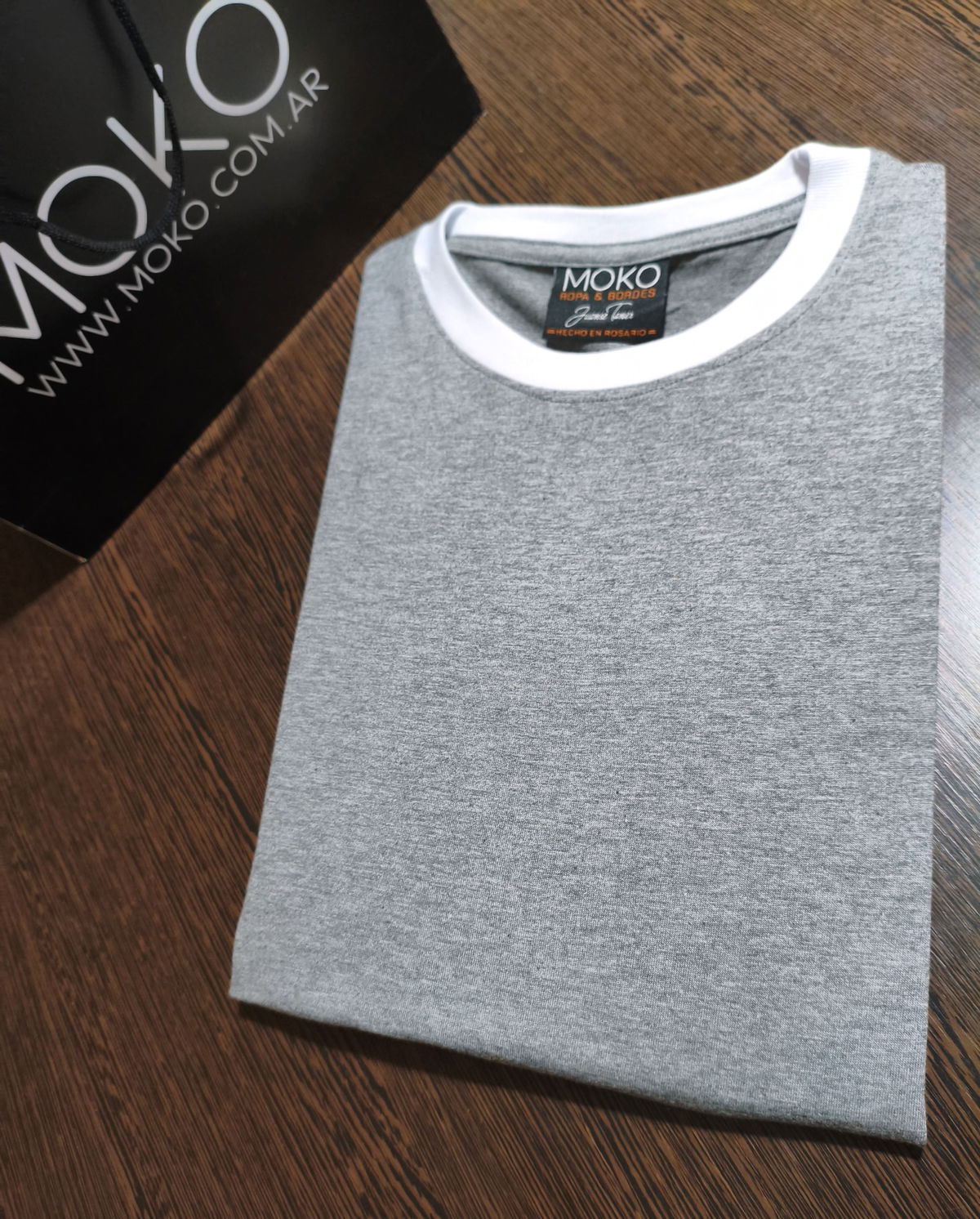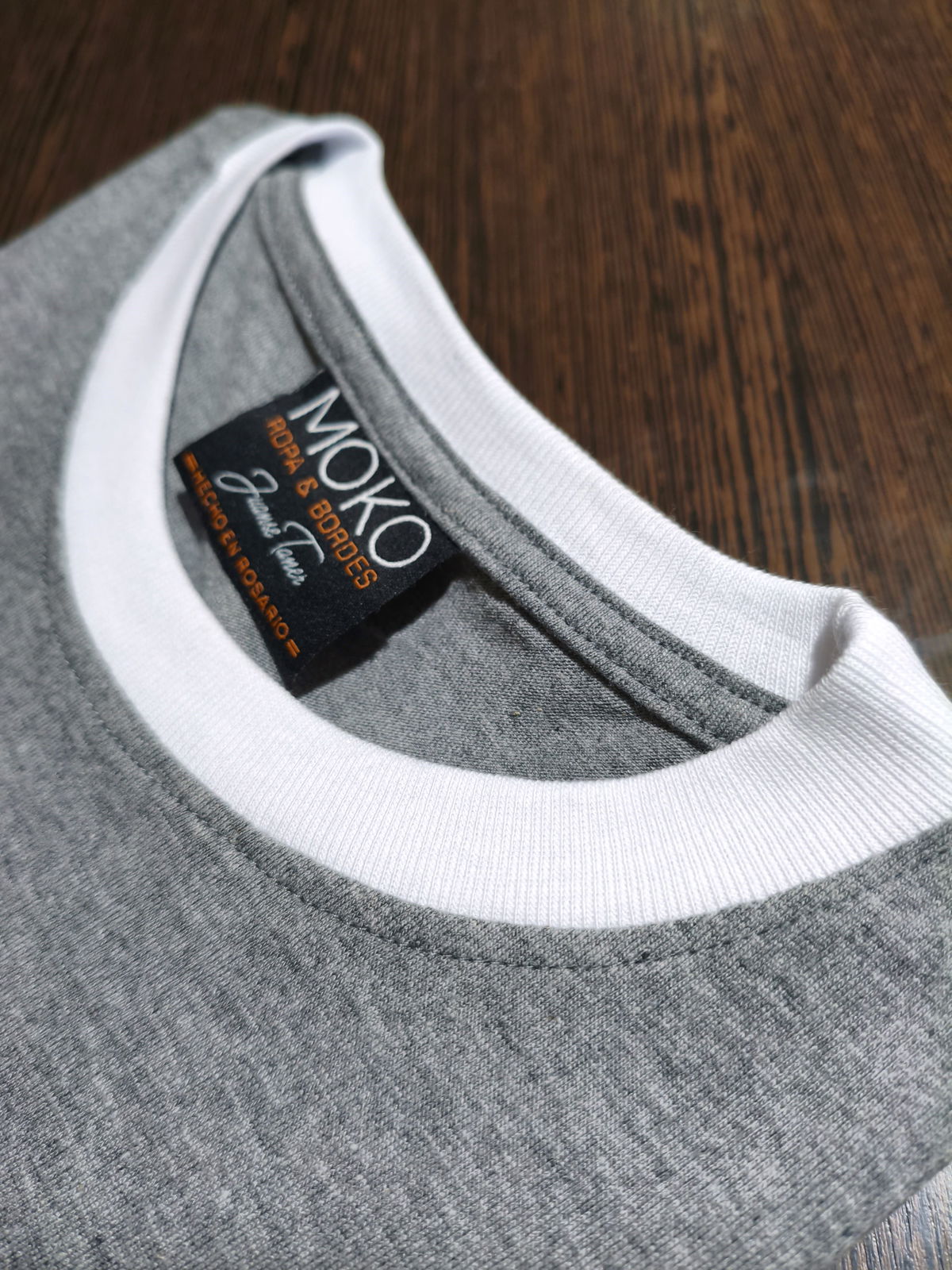 Remera de algodon 24/1 peinado , con rib en cuello y mangas , cuerpo en color gris melange y bordes en color blanco