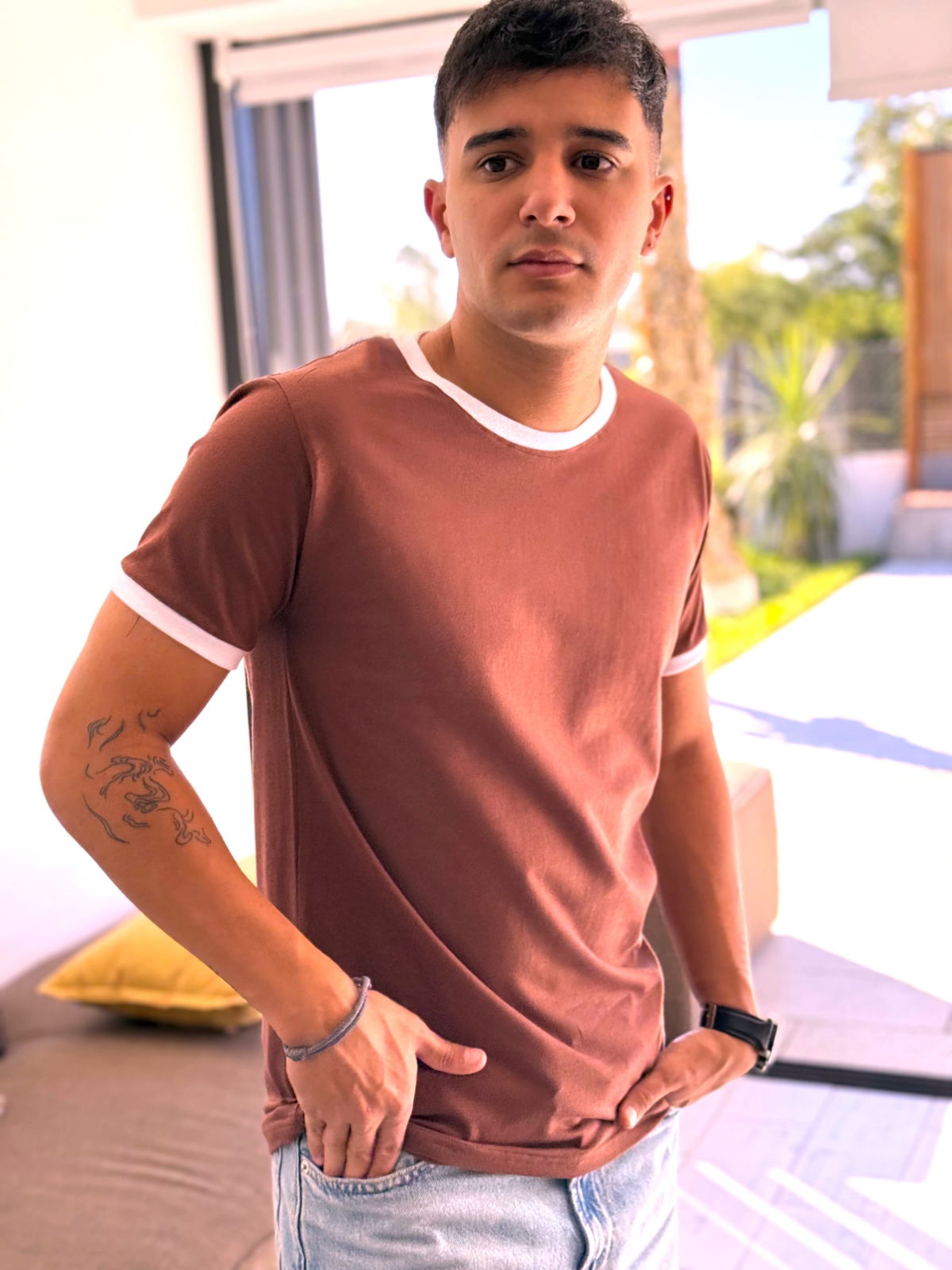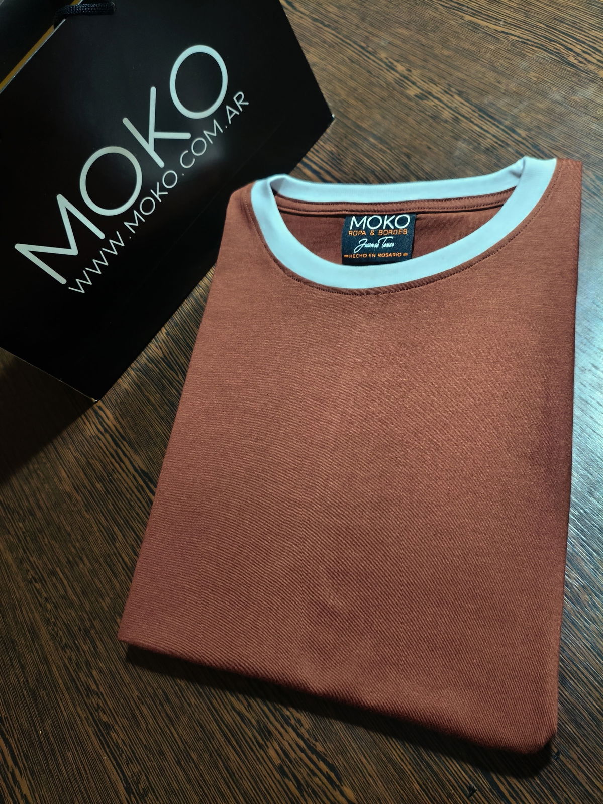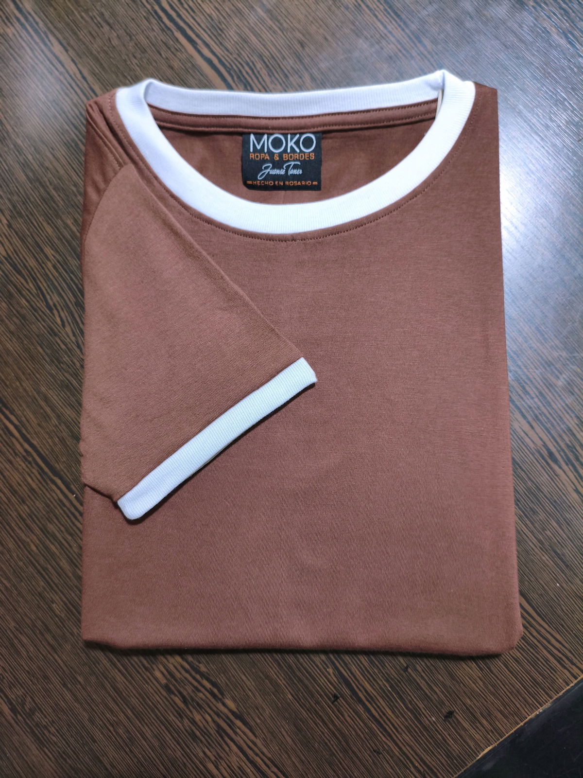Remera de algodon 24/1 peinado , con rib en cuello y mangas , cuerpo en color marron chocolate y bordes en color blanco