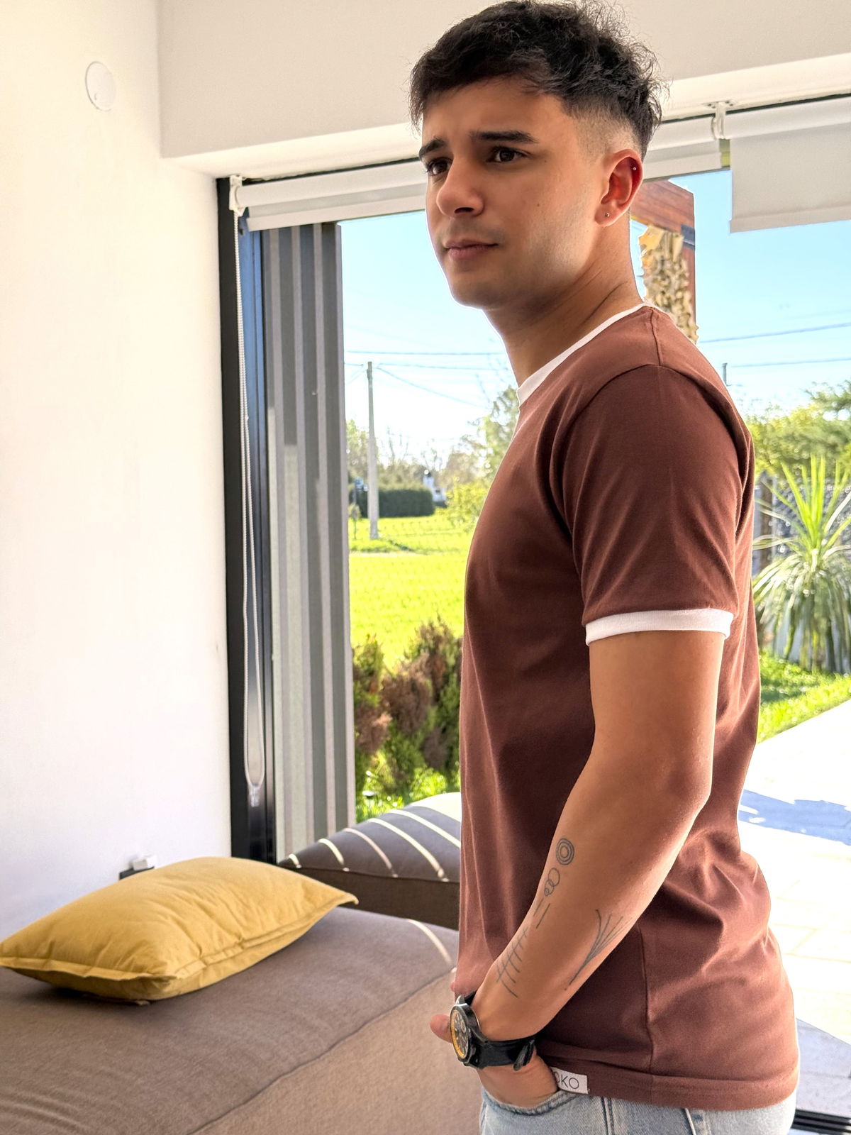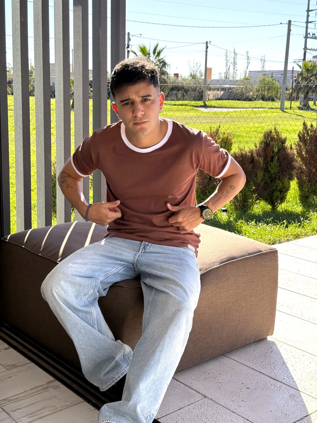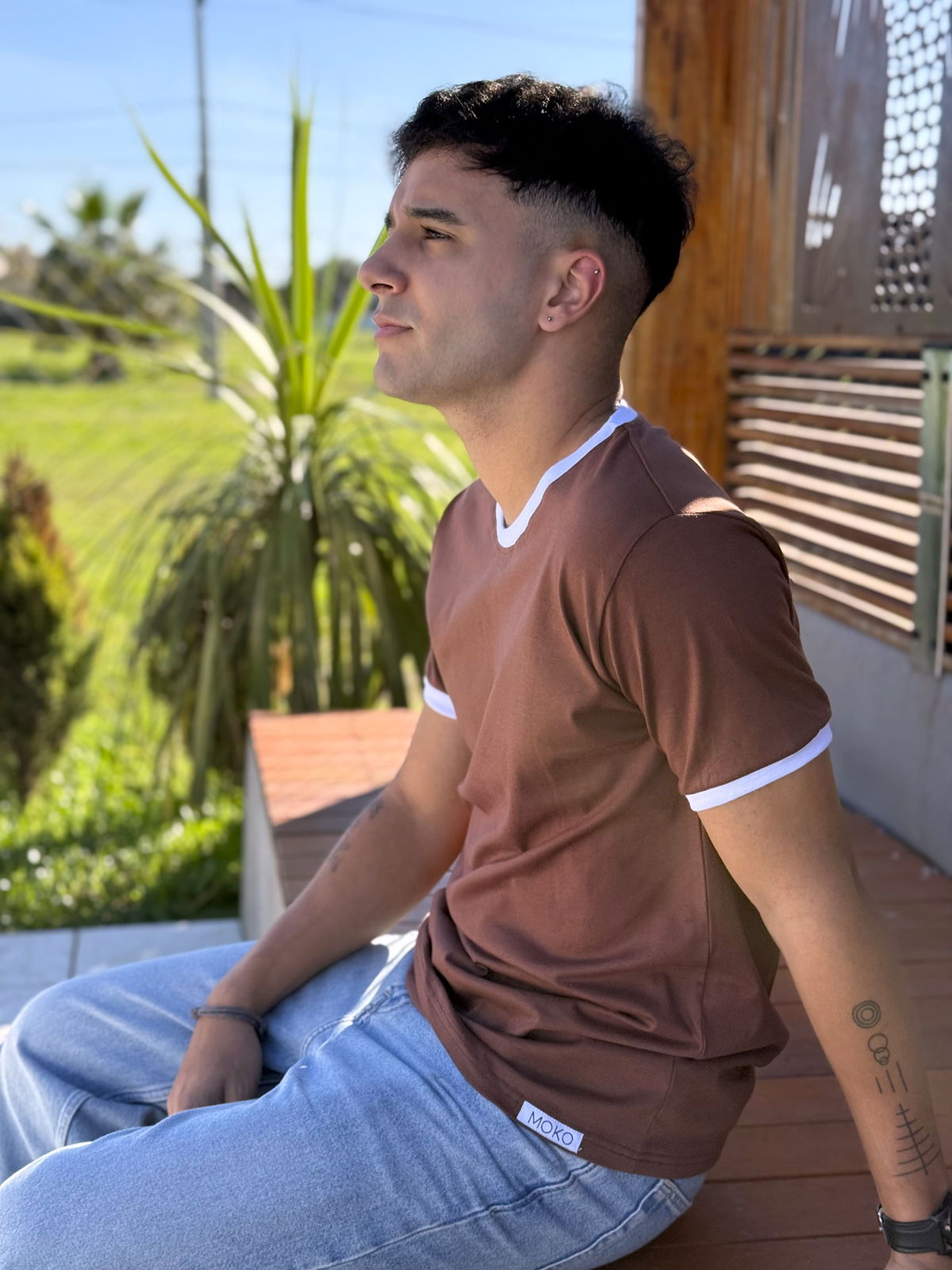 Remera de algodon 24/1 peinado , con rib en cuello y mangas , cuerpo en color marron chocolate y bordes en color blanco