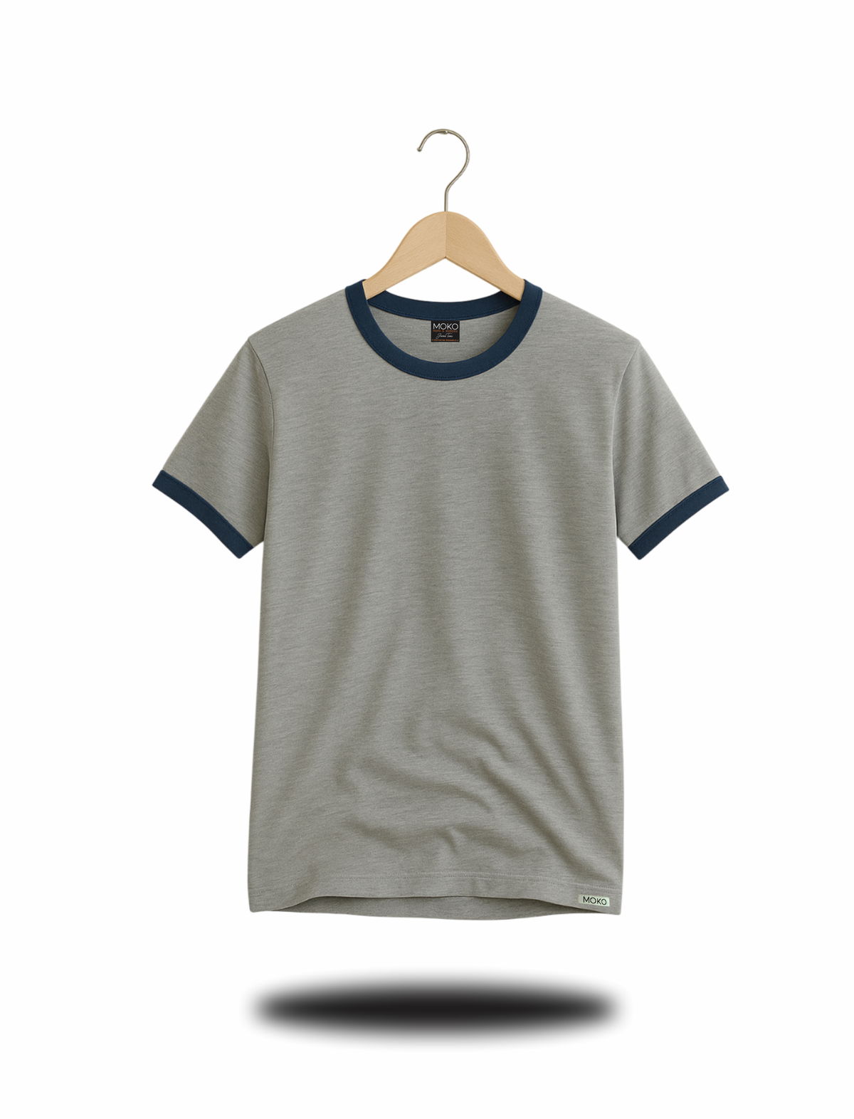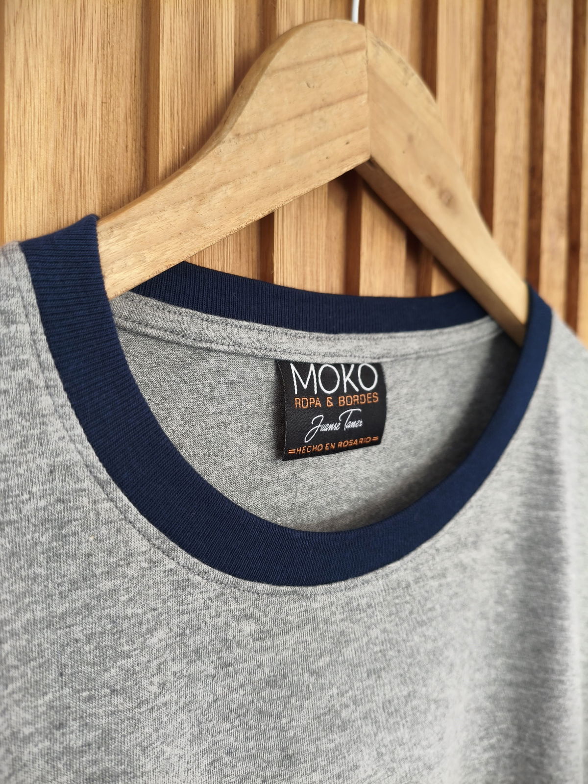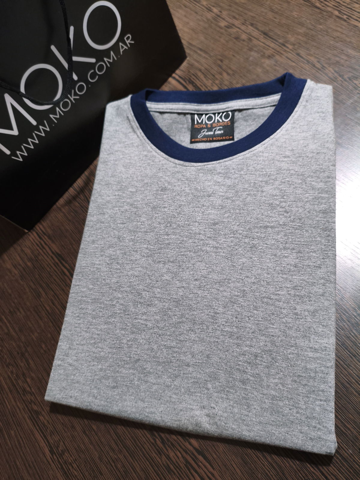 Remera de algodon 24/1 peinado , con rib en cuello y mangas , cuerpo en color gris melange y bordes en color azul oscuro
