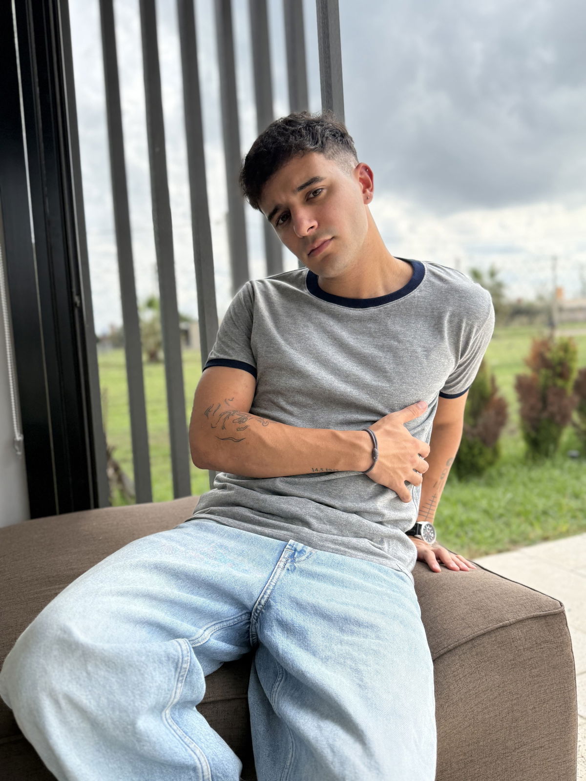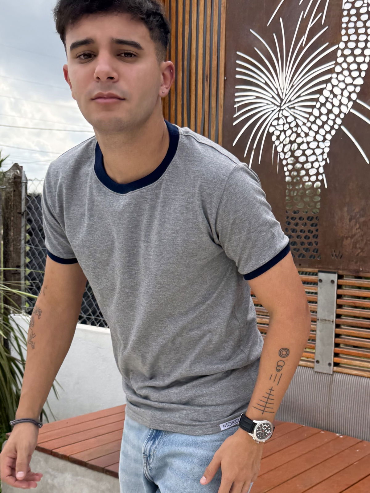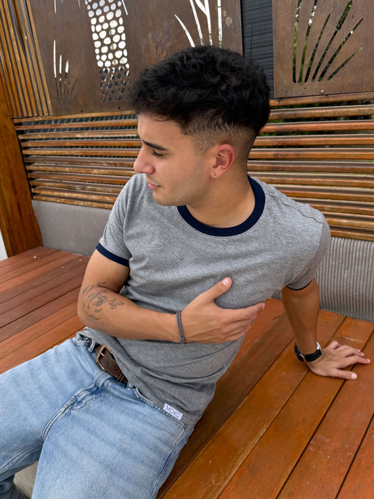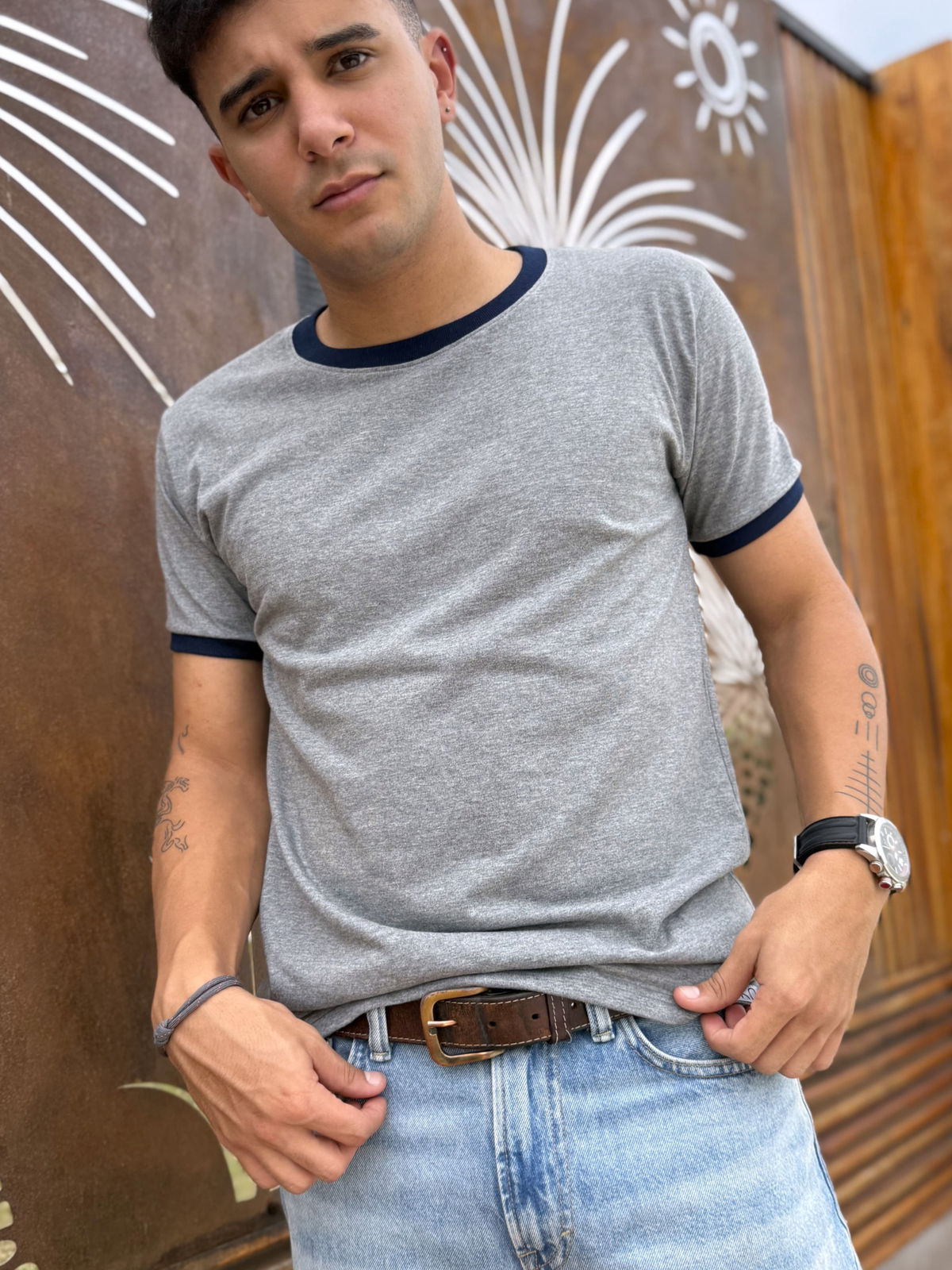 Remera de algodon 24/1 peinado , con rib en cuello y mangas , cuerpo en color gris melange y bordes en color azul oscuro