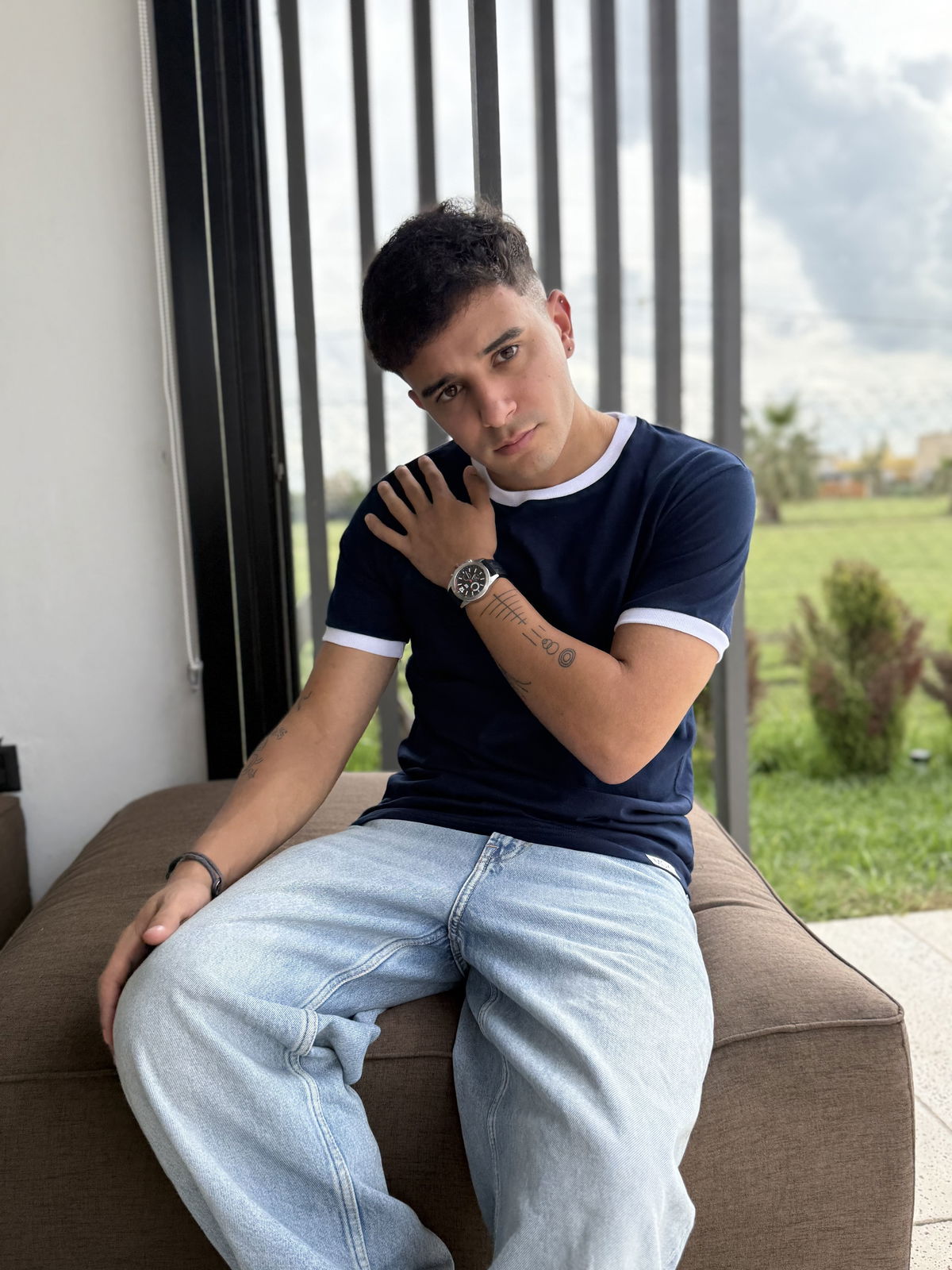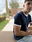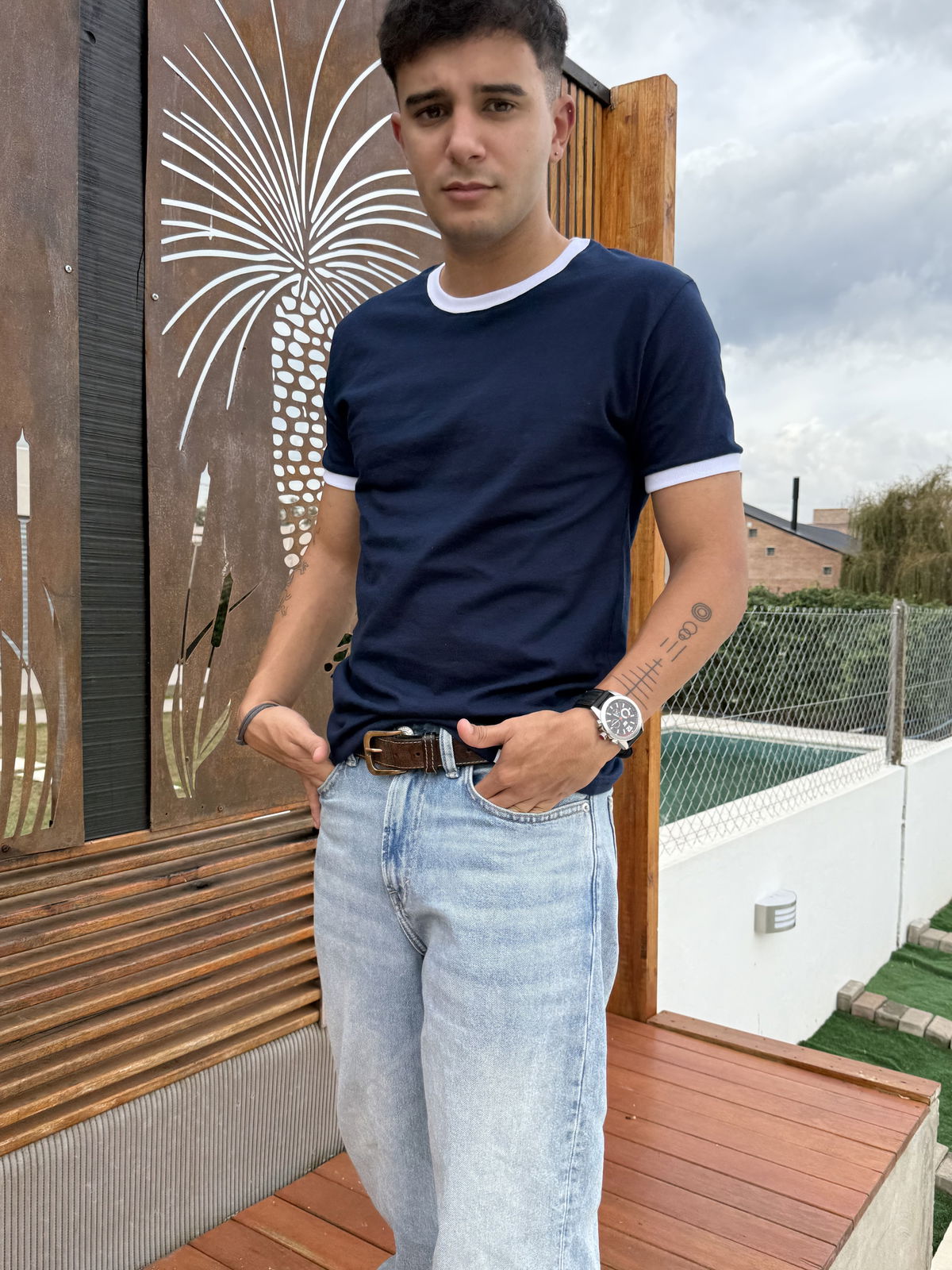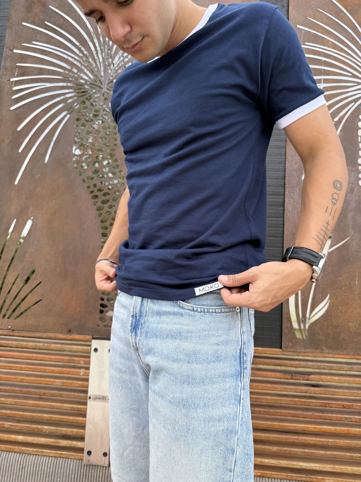 Remera de algodon 24/1 peinado , con rib en cuello y mangas , cuerpo en color azul oscuro y bordes en color blanco